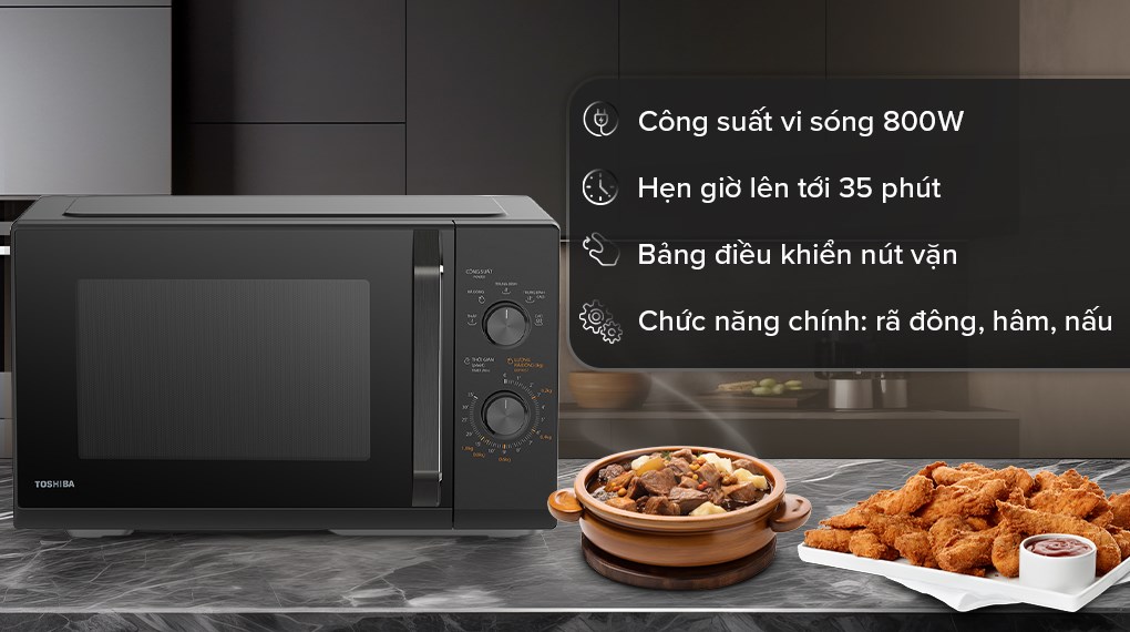 – Với công suất vi sóng tối đa 800W, được chia làm 5 mức (thấp – rã đông – trung bình – trung bình cao – cao), lò vi sóng Toshiba này giúp nấu, hâm nóng, rã đông nhanh chóng, tiện lợi.
