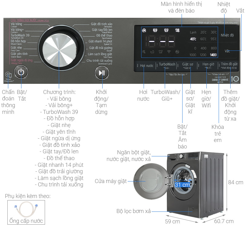 – Công nghệ giặt hơi nước Steam: hơi nước ở nhiệt độ cao len lỏi vào sâu trong sợi vải, đánh bay các vết bẩn cứng đầu bám trên mặt vải, tiêu diệt vi khuẩn, các chất gây dị ứng, giúp đảm bảo an toàn cho sức khỏe của cả gia đình và hỗ trợ giảm nhăn cho quần áo.