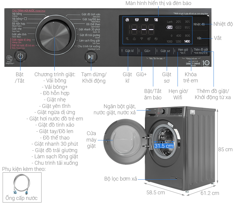 – Trang bị 14 chương trình giặt, đáp ứng tốt cho nhiều nhu cầu giặt giũ khác nhau, giúp giặt sạch và bảo vệ tốt cho chất liệu. Cụ thể là: chu trình tải về, vải bông, vải bông +, giặt đồ hơi nước trẻ em, ngừa dị ứng, giặt nhanh 14 phút, giặt nhẹ, giặt êm, vệ sinh lồng giặt, đồ hỗn hợp, thể thao, tinh xảo, giặt ga giường.