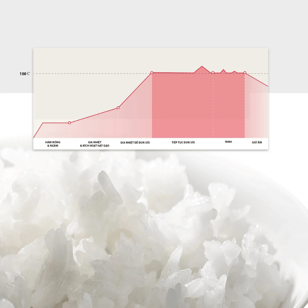 Công thức nấu cơm ngon chuyên nghiệp từ Toshiba: mỗi hạt gạo được nâng niu qua từng giai đoạn: hâm nóng, ngâm, gia nhiệt, đun sôi, ninh và giữ ấm tự động. Nhờ vào sự kiểm soát nhiệt độ – thời gian chuẩn xác đến từng giây, thành phẩm chính là những hạt cơm mềm dẻo, thơm ngon trọn vẹn.