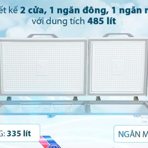 – Dung tích chứa 485 lít tương đương ngăn mát 150 lít và ngăn đông 335 lít phù hợp với các hộ kinh doanh nhỏ lẻ, tiệm tạp hóa hay các cửa hàng tiện lợi.
